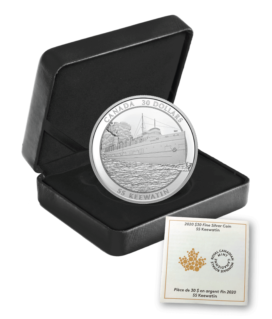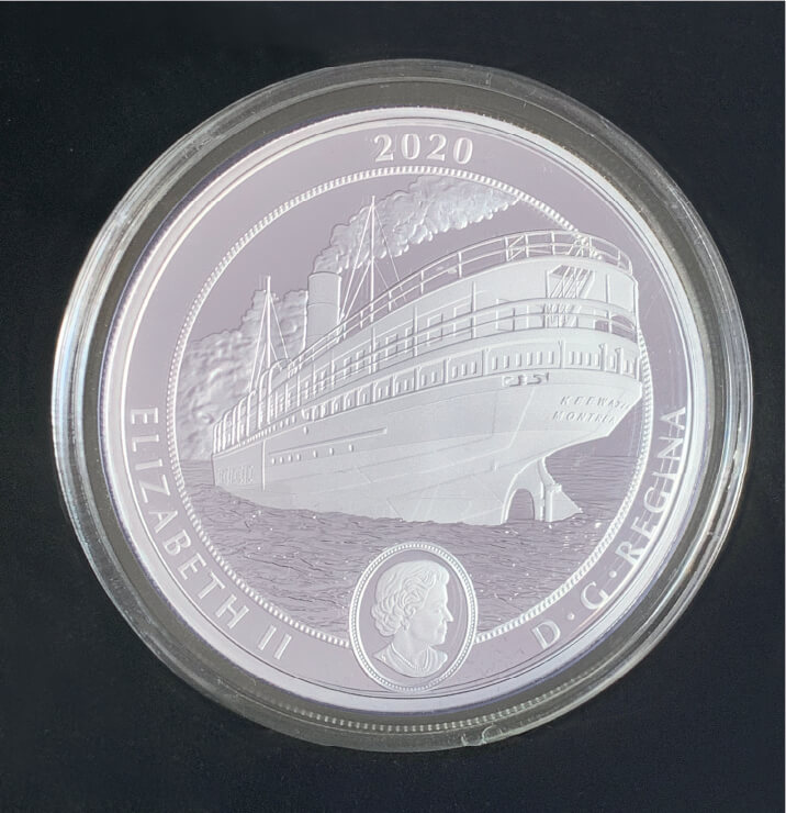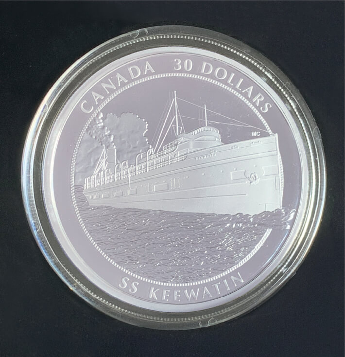The 2020 $30.00 fine silver S.S. Keewatin coin is of proof quality and is authorized by the Government of Canada. It has been expertly struck by the Royal Canadian Mint and has a limited worldwide mintage of only 3,000 pieces. The coins are made of 62.69 grams (2 troy ounces) of 99.99% of pure silver with a diameter of 50 millimeters. They were designed by Canadian artist Matt Conacher. The reverse design features a starboard bow view of the S.S. Keewatin and the obverse features a port stern view and the framed effigy of Her Majesty Queen Elizabeth II was a work by Susanna Blunt. The coins are encapsulated and packaged in Royal Canadian Mint display boxes and each comes with a numbered Mintage Certificate of Authenticity. The coins retail for $229.95 each and being pure silver they are fully tax exempt.
